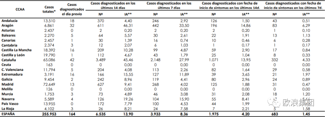 另外,西班牙今日多个地区传出新的疫情反弹,《国家报》表示,西班牙的新爆发点已经超过了100个,比上一周再增二十多个。 -卡斯提亚•莱昂大区宣布在Valladolid市发现新爆发点,目前确诊20人,属于家庭范围内的连环传播,被感染者里包括只有两岁的幼儿,大区卫生部门对33名接触者保持监视。另外,在Segovia省Cuéllar地区也有新爆发,有多人被确诊。 -中南部卡斯提亚•拉曼查大区CIUDAD REAL省下今日宣布在Socuéllamos小镇发现新爆发点,目前确诊18人,有52人被隔离观察,但所有新感染案例无人需要入院。 -近期以来相对平静的北部拉里奥哈大区今日宣布在刚过去的周末里新增确诊24例,其中3例属于在同一疫情点被感染,其余案例则分布在多个市政区,所有新确诊都无入院需要。 -卡斯提亚•莱昂大区Soria地区在一处英文学习夏令营发现新的爆发点,大区卫生部门宣布对夏令营20多名师生采取隔离措施,目前确诊7人名未成年人学生。