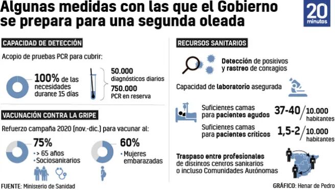 西班牙20分钟报消息,西班牙中央政府和自治区政府已经在为第二波新型冠状病毒做准备。 近日卫生部起草了一项关于应对第二波新冠病毒疫情的计划,该计划原则上将维持各自治区的所有疫情管理权利,并预计加强各大区的卫生系统能力,例如增加病床床位和ICU床位的数量。 政府希望各自治区建立“ 24/7/365预警信息系统”,并确保能够在所有医疗系统级别,特别是在初级医疗中心尽早发现病例。政府还强调各大区需要加强检测能力以便在尽可能短的时间内处理PCR检测,并发出预警。 计划中的措施之一是针对季节性流感进行疫苗接种,季节性流感是在11月至12月之间发生的年度流行病,通常持续约13周。该计划称不可能排除新冠新疫情与流感疫情同时发生,因此今年将额外购买疫苗,以扩大流感疫苗覆盖率。政府计划为65岁以上的人以及卫生和社会医疗人员的75%、60%的孕妇和高危人群接种疫苗,这样做的目的是避免流感和新冠同时发生时会造成更大的影响。 另一方面,该计划考虑建立国家卫生和药理材料战略储备,包括15天之内满足100%需求的PCR检测,每天能够实施50,000次检测。换句话说,预留750,000个测试盒。物料储备还包括预留近几个月FFP3口罩,防护眼镜,手套,防护服及一次性医用服的平均总消费量的25%。对于外科口罩和FFP2口罩储存量会更高。在有疫苗或特殊治疗之前,也将储备处方药物Cisatracurio, Midazolam, Propofol及Dexmedetomidina。