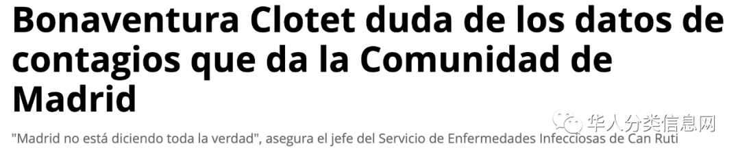 据西班牙el periodico报7月19日消息,加泰罗尼亚大区的Hospital Germans Trias i Pujol(badalona市)医院感染科主任Bonaventura Clotet近日对马德里的疫情数据表示怀疑,,现在加泰罗尼亚每日新增1000多例感染,而作为之前受疫情影响最严重的大区马德里,却仅新增数十例,甚至没有出现爆发,这让加泰罗尼亚专家表示非常怀疑。