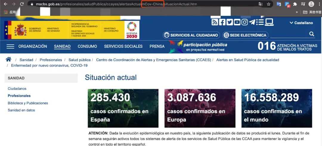 欧华报消息(记者 易安)近日,一名侨胞向本报提醒,西班牙卫生部发布当天疫情数据的官方网站,网址中出现“nCov-China”。