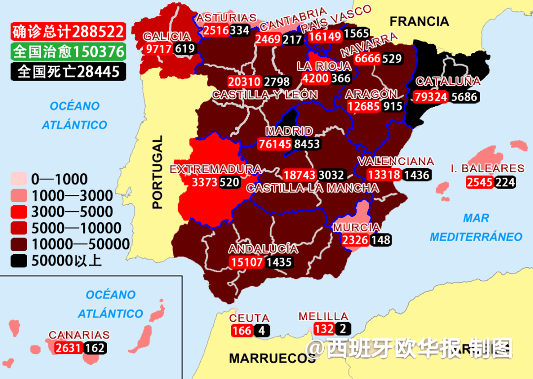 欧华报综合消息(编译 易安) 截止7月31日西班牙卫生部发布数据,经过PCR核酸检测的确诊患者累计288522人,治愈150376人,死亡28445人。