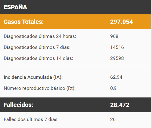 截至今晚西班牙卫生部最新数据:全西累计PCR核酸检测确诊290574例,死亡28472例。卫生部公布24小时内检测出新增968例。