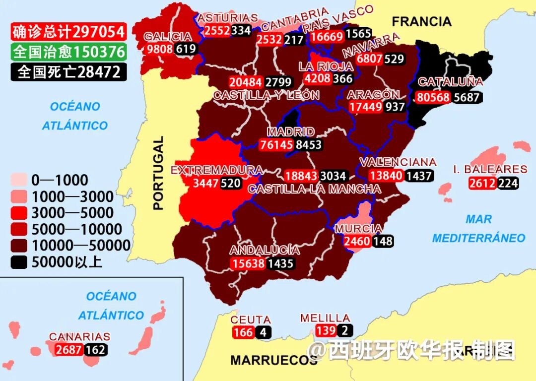 欧华报综合消息(编译 易安) 截止8月3日西班牙卫生部发布数据,经过PCR核酸检测的确诊患者累计297054人,治愈150376人,死亡28472人。