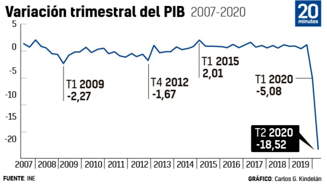 本次关停25家购物中心涉及员工8000多名。英国公司集团总裁Marta Álvarez表示,近年来房地产的价格上涨幅度很高,英国公司的资产重组策略是将效益相对不好的购物中心转化成出租或出售的地产项目,并维持其运转,包括土地、办公室、商业用地和物流平台等。 此次英国公司集团大规模关停购物中心,也可谓断臂求生。根据7月31日西班牙公布最新经济数据,第二季度西班牙的GDP下降18.5%,跳崖式下跌,远远高过已经很糟糕的第一季度的5.2%。经济学家表示,西班牙的经济已经陷入有史以来最严重的衰退,超过2008年的经济危机,并将过去6年西班牙经济复苏的成绩消耗殆尽。 西班牙2007年至2019年第一季度和第二季度的GDP变化