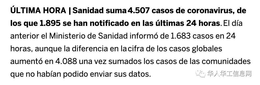 卫生部通报1895例,但实际感染人数为4507例。按照卫生部的说法,马德里今日新增567例感染,成为感染数量最多的大区(不过加泰罗尼亚今天通报新增1181例确诊),其次是巴斯克地区,403例。阿拉贡由于技术问题本周五未通知其数据,西班牙这周已经出现了三次“技术问题”,导致疫情数据没有上传”