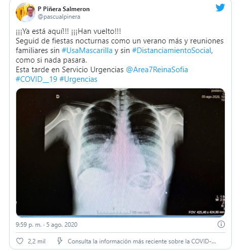 当被问及射线照的含义时,Piñera回答说:“肺部射线是可透的。而在X射线片上看到上半部整个是黑色。在两个肺部的底部看起来都是不透明的,新冠病毒是会伤害肺部的。” 在这个夏天西班牙许多病毒聚集性暴发是由于聚会夜店或由于没有保护或预防措施的朋友聚会引起的。目前西班牙每天新冠感染人数激增到1683例,有673人住院治疗,每天41名患者需要入住重症监护病房(ICU)住院,并又造成22例死亡。 马德里夜店主动关门抗疫政府防疫措施!