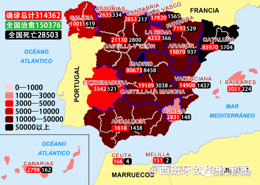 欧华报综合消息(编译 易安)截止8月7日西班牙卫生部发布数据,经过PCR核酸检测的确诊患者累计314362人,治愈150376人,死亡28503人。