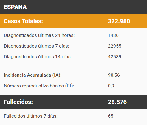 全西累计死亡28576例,最后24小时内按照西班牙卫生部的计算方式:新增确诊1468人。那么周末两日减去这1468例,等于两天多了7150例确诊。 目前西班牙警报状态后“新常态”下的疫情爆发点在倍增,而新常态下的控制措施,对阻止病毒传播等于没有用处。据西班牙ABC报报道称:西班牙最近两周来的确诊、入院和重症病房人数都在倍速飙升,死亡案例方面(除开瞒报)或许也只是时间问题而已。西班牙最近7日内新增病例达到2万例,较七月中旬来说翻倍。7月份的时候新增病例主要出现在加泰罗尼亚大区和阿拉贡大区,但是近日来加泰罗尼亚和阿拉贡大区占比较少,并不是因为新增病例下降,而是因为马德里、瓦伦西亚、安达卢西亚和巴斯克地区的新冠确诊病例在疯狂飙升!