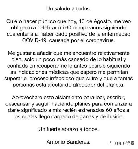 在Twitter发布的推文中,Antonio Banderas也提到自己现在感觉还好,只是比平常时候要多点疲倦,他相信自己会很快康复的。他还表示:“自己利用隔离的这段时间来阅读、写作、休息并制定其他的计划,这样的日子让他的60岁有了别样的意义。”