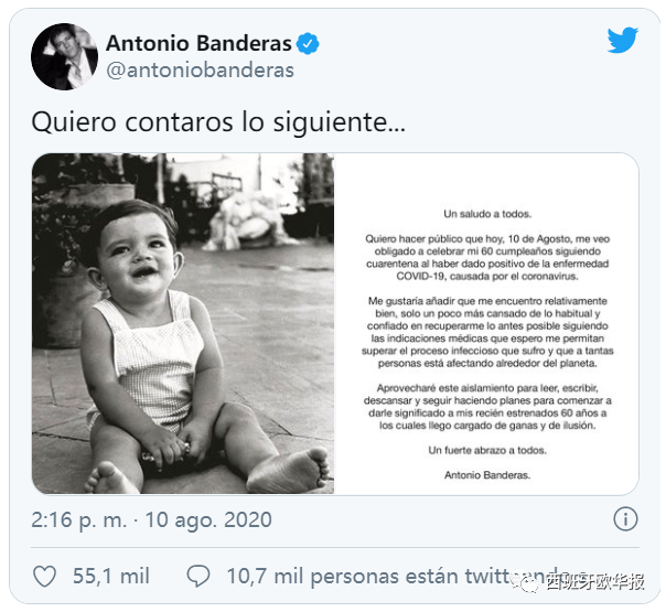 目前两名确诊患者已经居家隔离,根据西甲和瓦伦西亚足球俱乐部协议,已向卫生部上报了这一情况。这是球队第二次报告感染,上一次是在3月在米兰与亚特兰大比赛后,这也使瓦伦西亚俱乐部成为西甲第一支出现确诊的球队。 西班牙名演员 戛纳影帝确诊感染 60岁生日隔离度过 世界报消息(编译 鄂渊) 本周一是西班牙知名男演员Antonio Banderas的生日。生日当天,却收到了一份出乎意料的“礼物”。他发文透露自己确诊感染了新冠病毒:“今天(8月10日)是他的60岁生日,只能在隔离中度过。”