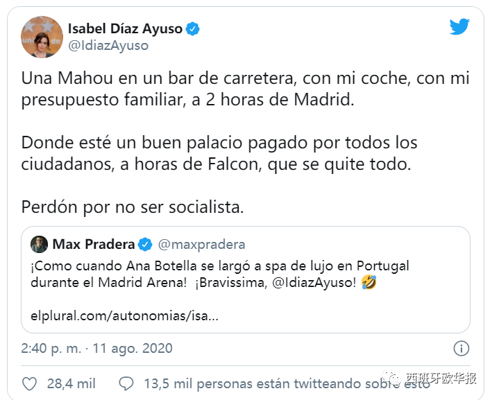 对此,Ayuso当天就做出回应,在Twitter上转发Pradera的推文并非常强硬地表示:“花自己家的钱,开我自己的车,跑到距离马德里两个小时以外的地方,坐在街边酒吧上喝瓶Mahou。”言下之意,这都惹到您了?于是她顺带把桑切斯也拉下水:“坐Falcon私人飞机,飞到全体国民‘养着’的豪邸,把眼前是统统抛到脑后。真是生而不是社会主义者,我很抱歉。”