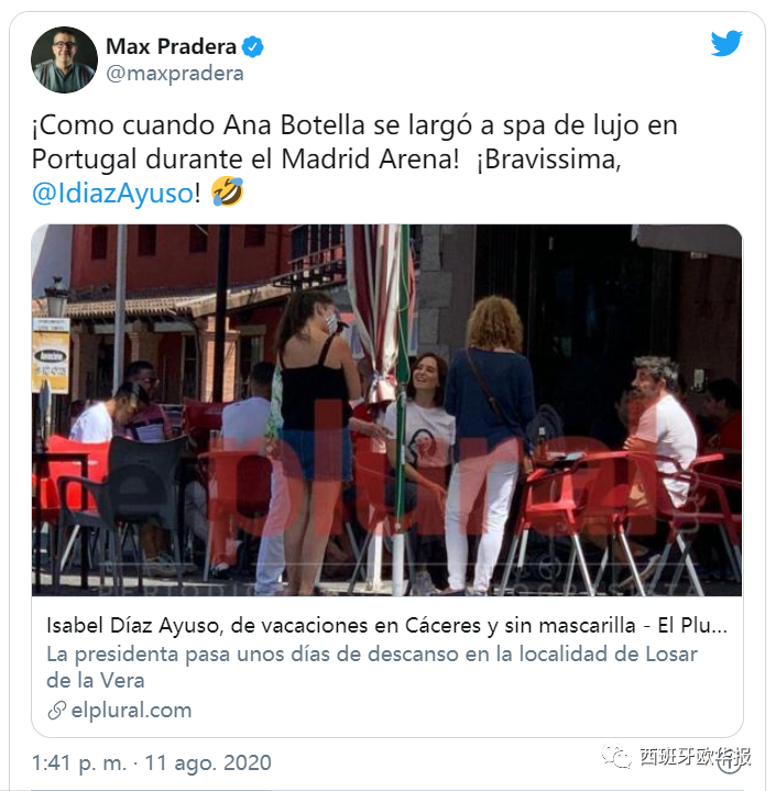 Pradera的推文内容是:“就跟Ana Botella在2012年马德里体育馆事故之后,跑到葡萄牙泡豪华温泉一样!真是太优秀了,Ayuso!”