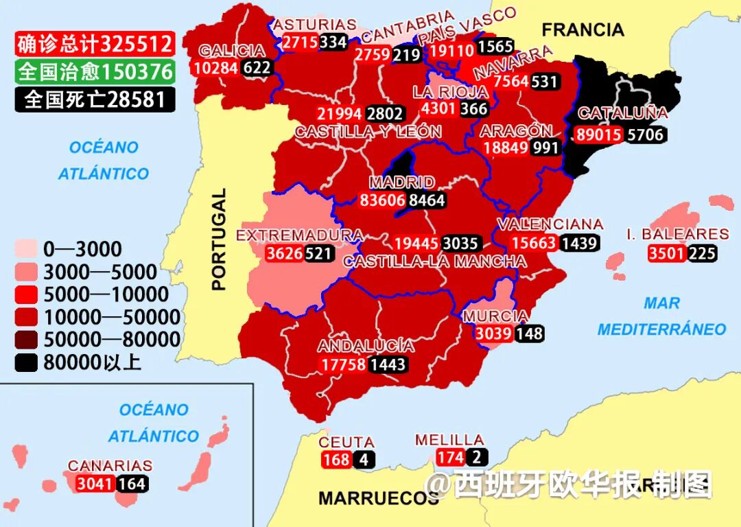 欧华报综合消息(编译 易安) 截止8月11日西班牙卫生部发布数据,经过PCR核酸检测的确诊患者累计325512人,治愈150376人,死亡28581人。