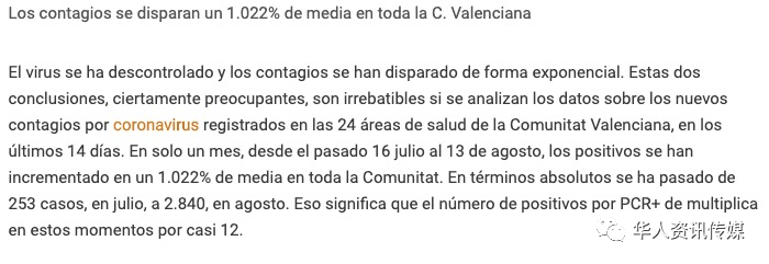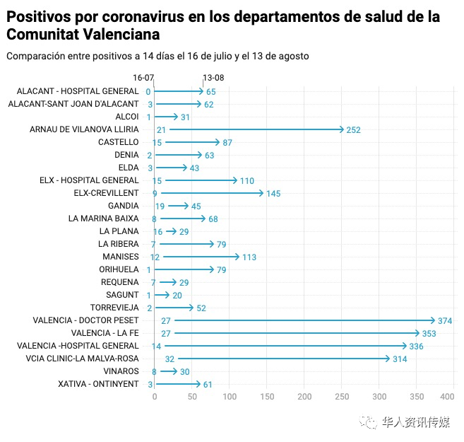 根据西班牙当地媒体LEVANTE报道,新冠病毒已经失控,感染率直线上升。如果分析过去14天在瓦伦西亚自治区24个卫生区登记的新增确诊感染数据,这样的结论无疑令人担忧。从7月16日到8月13日,仅一个月时间,整个自治区的确诊感染者平均增加了1.022%。从绝对值上看,从7月份的253例增加到8月份的2840例,这意味着感染人数增加了12倍。 旅游业和人口最多的巴伦西亚市区以及 Elx感染病例最多,集中了48.46%的感染病例。València-Doctor Peset, València-La Fe, València-Hospital General y València Clínic-La Malva-rosa 处于领先地位,共计1,377名感染病例。 而在Dénia,Castelló,Orihuela和Torrevieja,最近几周感染率也成倍增长。Manises地区感染率占自治区总数的3.97%,113例;Arnau de Vilanova-Llíria 占8.87%,有252例。