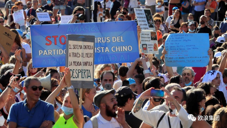 '#StopConfinamiento'平台主管Carmen女士向媒体说:“我们组织了这个抗议行动。这是政府限制自由权利的借口,病毒并不存在,也没人死亡。”“他们管理的PCR核酸检测均是无症状的阳性病例。我们要恢复自由,照常地营业、上班和上学,不能整天都戴口罩。”一些抗议者说,“很多检测结果是假阳性,没有病毒,每年癌症和流感死亡人数更多。”“医院病房空空的,没有人入院。”抗议者中也有人戴口罩,他们解释说:“我戴着口罩,因为我不想其他人不安。”示威者打出多个抹黑和诋毁中国的标语,称“病毒诞生在中国,还以为中国是最好的贸易伙伴吗?”(上图)