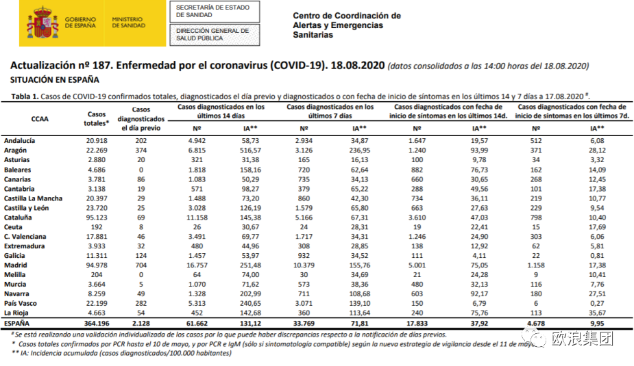 EL Pais日报表示:西班牙报告新增5千例,30%集中在马德里 欧浪新闻8月18日(马德里 柳传毅编译) 西班牙《EL Pais》表示,西班牙今日新纪录五千多例,新增患者的三分之一在马德里自治区。依据西班牙卫生部今日的疫情数字,西班牙至今日为止累计PCR核酸确诊364196例,过去24小时新增2128例*。另外,西班牙累计死亡28670例,过去7天新增死亡63例。 如西班牙《EL Pais》等主流媒体的解读,因为西班牙至昨天的累计为359082例,今日增至364196例,所以,今天实际比昨天高出5114例,《EL Pais》并说,24小时新增的2128例里,三分之一集中在马德里自治区(704例),其次为阿拉贡(+374)、巴斯克(+282)、安达鲁西亚(+202)、加利西亚(+124)、加那利群岛(+86)。比较突出的是加泰罗尼亚只新增了69例。 *卫生部报表标注过去24小时仅新增2128例,因为卫生部只把在24小时内接受检测和得出结果的人视为日增,而在其他日子接受检测,并因工作量问题而拖至近24小时才有结果的病例不被视为日增,这些新病例被统计在累计里,但不出现在24小时新增数字里。这是西班牙卫生部对日增的定义和报告日增数据的方法。我们之所以作出附加解释,是为了更全面理解西班牙的情况和看懂西班牙卫生部的数据,这也是西班牙El Pais、El Mundo等主要媒体的报道和对卫生部疫情数据的解读方式。 另外,加泰罗尼亚卫生部门今日报告新增了544例,这等于544例里有很多是在其他日子测出,但检测结果至近24小时才出现。所以,加泰罗尼亚报告的日增比卫生部的记录要高,也是与上述的数据采集和日增定义有关。但无论如何,加泰罗尼亚的疫情有显著缓和,因为比该大区昨天报告1044例要少近半。加泰罗尼亚过去四天日增都在1千以上,今日则有显著的回落。 马德里自治区则继续是全国日增最严重的大区,依据卫生部的记录,马德里至今日的累计为94978例,至昨天为93359例,因此,马德里累计数字比昨天多出1619例。