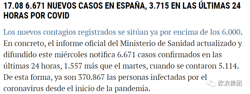 西班牙《国家报》以西班牙日增6671例为题报道今日的严重疫情。 欧浪新闻8月19日(马德里 柳传毅编译) 西班牙最大媒体《国家报》表示,西班牙冠状病毒案例的增速保持非常显著,卫生部今日报告新增6600多例,死亡比昨天增长了127例。鉴于西班牙的严重爆发,欧洲疾病预防控制中心已经对西班牙发出警报,指出西班牙已经成为近14天最多确诊的欧洲国家。《国家报》并说,北部加利西亚自治区宣布对有严重爆发的A Coruña市18至40岁居民进行新冠检测, 卡斯提亚·拉曼查自治区(Castilla-La Mancha)宣布对Albacete省下4000人口的小镇Villamalea采取隔离措施,该小镇有99人被确诊。 依据西班牙卫生部官网今日的疫情数字,西班牙至今日为止累计PCR核酸确诊370867例,过去24小时新记录3715例*。因为西班牙至昨天的累计为364196例,而今日升至370867例,因此,如《国家报》和《世界报》等外文媒体所言,西班牙过去一天实际是增长了6671例。