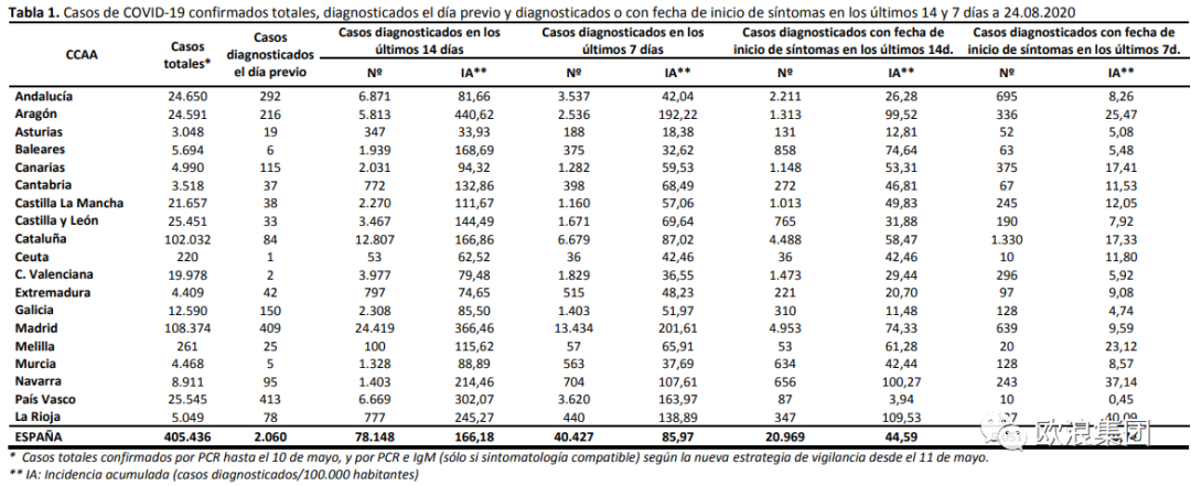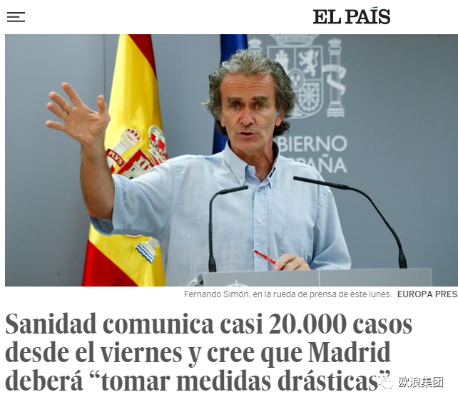 欧浪新闻8月24日(马德里 柳传毅编译) 西班牙主要媒体《国家报-El Pais》报道说,西班牙新冠病例已经突破40万,在刚过去的周末三天里(周五至周日,卫生部周末不报告疫情)新增近20000例。马德里重新成为全国最高确诊的自治区,卫生部发言人西蒙认为马德里必须采取“剧烈性措施”,这是马德里必须封城的暗示。 依据西班牙卫生部下午颁布的最新疫情数据表,西班牙至今累计PCR核酸确诊405436例,因为西班牙至上周五时为累计386054例,等于三天时间里新增19382例。这个数字非常高,折合平均每日增长6400多例。西班牙在一周多前刚突破30万例,只用了几天再突破新的十万,增速非常可怕。