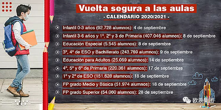 欧浪新闻8月25日(马德里 柳传毅编译) 马德里自治区政府今日颁布新学期开学方案,开学日期将在9月4日至28日之间,以逐步方式复课。复课方式将为半现场半在线,马德里将安装6000部摄像头,让被隔离在家的学生可以在家远程上课。大区政府并预备购买7万台电脑,分配给老师和学生以便作为远程上课工具。为防止传染,大区政府还计划购买70万升水凝胶液,并将学校的清洁预算增加1500万欧元,以防止冠状病毒传播。 马德里大小学校的不同年龄学生的开学日期如下: -9月4日,0岁-3岁幼儿园 -9月8日,3-6岁幼儿班和小学一至三年级 -9月9日,初三、初四和高中 -9月14日,成年班级 -9月17日,小学四至六级 -9月18日,初一初二和专科基础班 -9月28日,高等专科