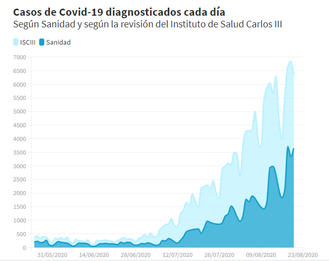 西班牙ABC报消息,西班牙卫生部在其每日报告中公布的前一天诊断出的新冠状病毒病例数与卡洛斯三世健康研究所(ISCIII)审查后的实际数字相去甚远,实际上,ISCIII每天检测到的新阳性病例数结果是卫生部通报的阳性病例的两倍。 例如在8月20日的报告中,卫生部通知了前一天检测到的3349例病例。但是,ISCIII随后对数据的审查得出了8月19日诊断出6843例感染病例,是卫生部公布的两倍。 根据ISCIII的数据,到目前为止,最戏剧性的一天是8月21日星期五,当天新增感染了7271例病例,但卫生部却没有公布新增病例。 双方公布的新增新冠病例的差距有时甚至会更大。例如在8月11日星期二,卫生部通报前一天诊断出1418例病例。但根据ISCIII的数据,在8月10日星期一,新增病例是卫生部通报的四倍,达到5439例阳性病例。 卫生部每天在其新型冠状病毒的统计报告中发布前一天诊断出的病例。但是,该数字是临时的。随后,卡洛斯三世健康研究所根据由国家流行病学中心(CNE)管理的国家流行病学监视网络(RENAVE)的数据,对数字进行审查。这些信息来自于每个自治社区在识别Covid-19病例后完成的流行病学调查。因此,差异是由于自治社区通知的延迟造成的。 ISCIII每隔7天发布一次数据,延迟一星期才能进行修改。即便如此,这些数据仍不确定。 西班牙卫生部:不会再全国大规模禁闭!不会隔离马德里!