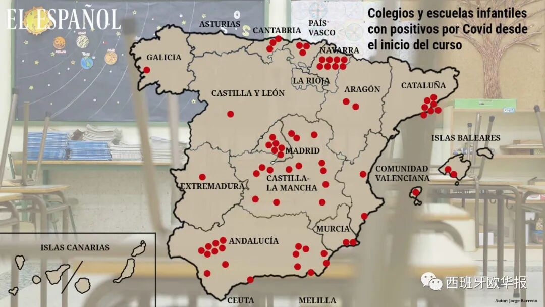 与此同时,西蒙指出,西班牙疫情致死率也在大大降低,称西班牙和德国可能是欧洲疫情死亡率最低的国家。根据分析,卫生部发现因疫死亡的患者平均年龄已经达到86岁,比之前疫情高峰时的83岁又涨了几岁。 开学第一周:确诊隔离增加 70所学校受影响 ![]() ![]() 就拿马德里来说,在开学前对105,000教师进行血清学检测或PCR检测;据El Periódico报道,Casa de Niños de Parque Coimbra (Móstoles)由于一名老师被确诊,该校尚未开放。Latina区CEIP República de Uruguay学校在9月9日,开学第二天,某班一名小学生被确诊,校长紧急通知该班级的11名学生家长,为保险起见,对孩子们进行居家隔离。据卫生部报告,这是马德里第一所公立学校出现确诊病例,而且是家庭内部感染,孩子的父母也均为确诊患者。 由于学校出现的感染情况不少,具体情况不再详述,El Periódico特地统计了目前西班牙全国受到疫情影响的学校名单: Andalucía