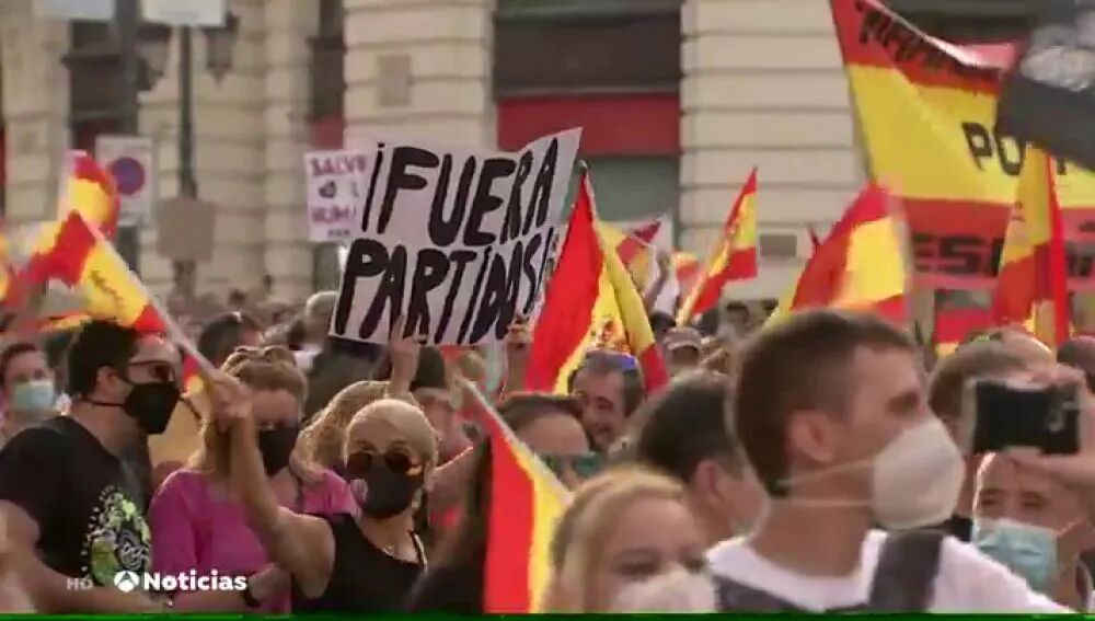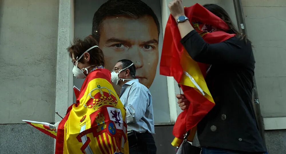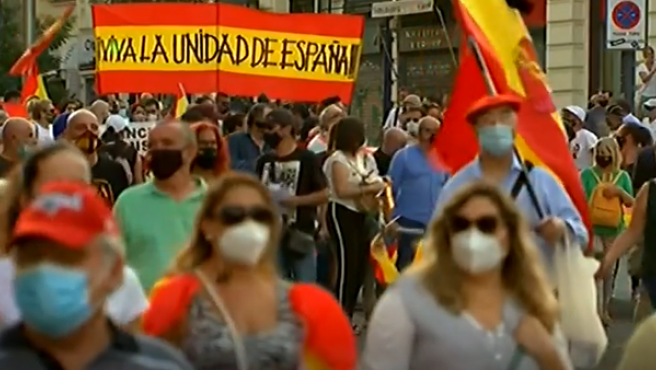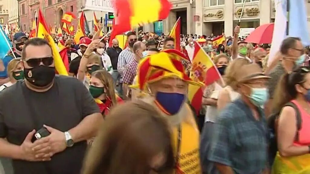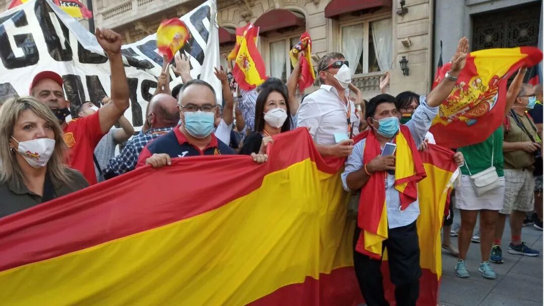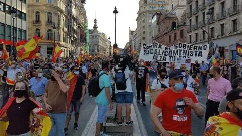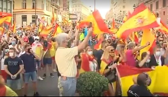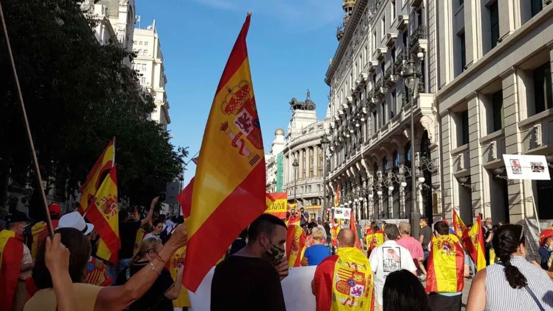 西班牙20分钟报消息,据中央政府驻马德里地区代表处消息,本周六大批人群聚集在马德里抗议,要求首相佩德罗·桑切斯辞职。抗议游行队伍从阿尔卡拉街(Calle Alcalá)出发,到科隆广场(Plaza de Colón)结束。 抗议者佩戴口罩,高举西班牙国旗,同时大喊“政府下台!”以及“自由,自由!”等口号。 在游行成员所持的标语中,有些谴责西班牙政府在疫情期间的灾难性管理:“他们不是政府,他们是雇佣军”或“他们是凶手”。抗议者也痛斥政府对加泰罗尼亚危机的管理不当。 抗议活动开始后不久,一群抗议者与警察发生了冲突,一名58岁的男子被捕。据警方消息人士称,对他的逮捕是因为他对警方的抵抗。