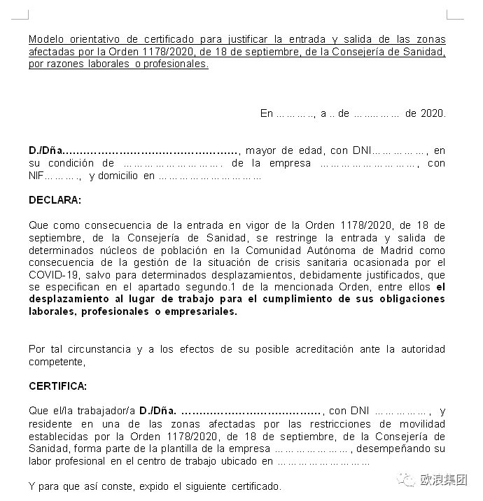 https://www.comunidad.madrid/sites/default/files/doc/sanidad/certificadojustificanterestriccionmovilidadcovid-19.docx 如马德里大区政府官网介绍,这是“进出受马德里自治区政府第1178/2020号法令影响的区域的指导性证明文件模板”。这是一个因工作理由而需要离开/进入隔离区的文件模板,上面部分填写工作者的姓名,下面部分填写工作单位的信息和地址,该单位声明持件的工作者为公司的职工,因此需要离开或者进入隔离区,下面是公司和职员签名。 这是官方提供的指南性模板,并不是一定要使用,也可自己草定。其他看病、或者上庭或其他行政事务,持有相应的文件应该可以被放行。 来源:欧浪网 |
