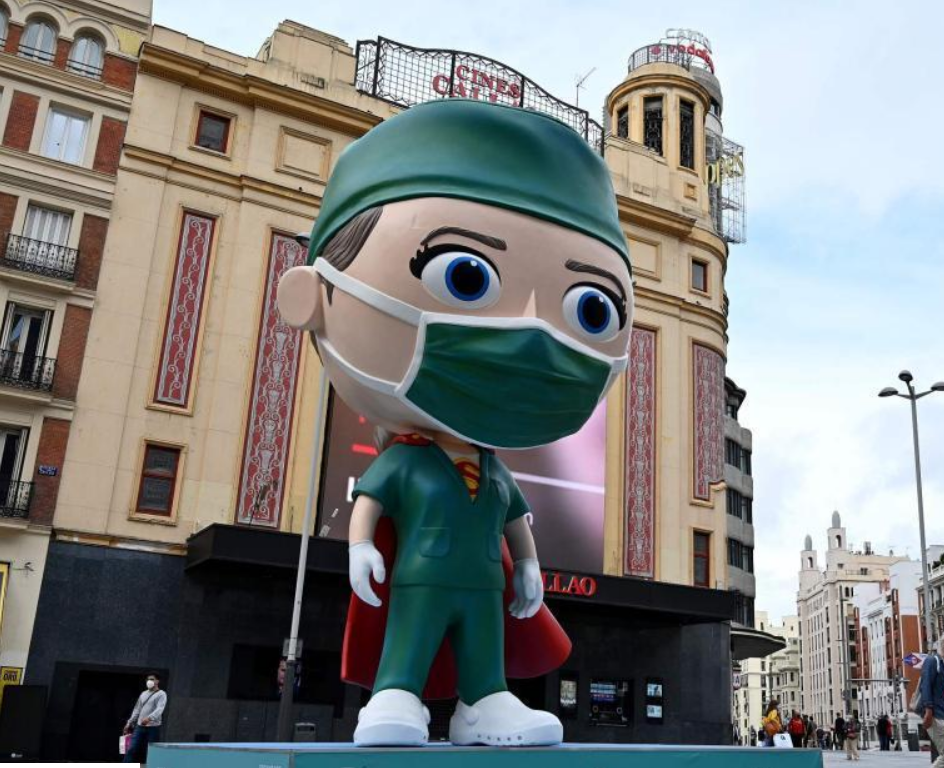 近日马德里市中心的callao广场上出现了一樽6米高的“医护超人”巨大玩偶,用来致敬新冠病毒抗争的医护人员们。