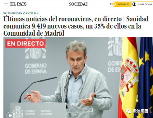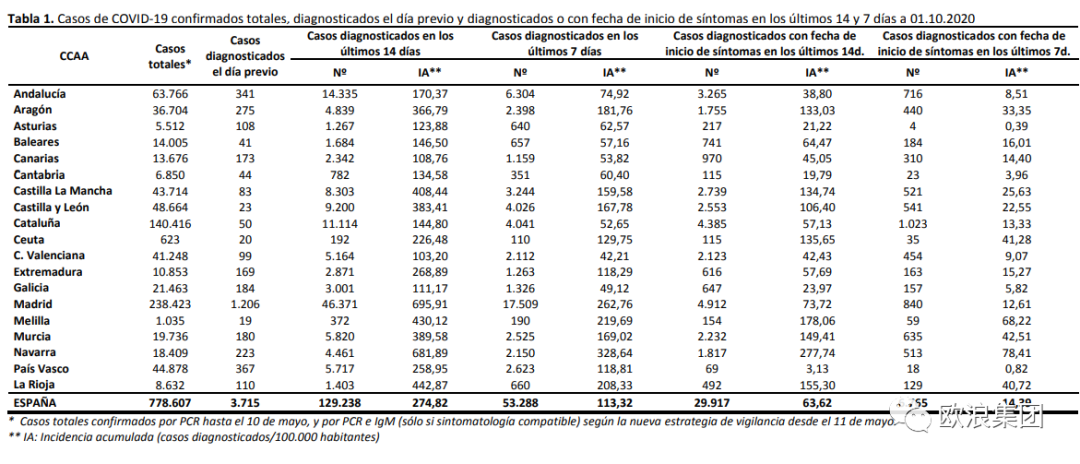 西班牙《国家报》表示,西班牙新纪录9419例,35%在马德里。 欧浪新闻10月1日(马德里 柳传毅编译) 依据西班牙卫生部下午颁布的西班牙疫情数据,西班牙累计778607例,过去24小时新增 3715例,累计死亡31973例,单日新增182例。 对照 西班牙至昨天的累计(769188例),西班牙过去一天实际增长了9419例,但只有3715例属于近24小时新增,等于有5700多例在其他日子接受检测,但至今日才分析出阳性结果。西班牙前天的日增不满万,昨天为1.1万,今日重新降至9400多例,貌似有微弱下降。