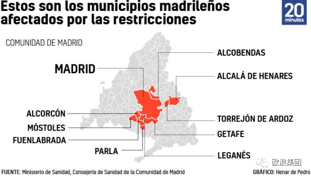 -近14天每10万人累积发病率IA指数达500例; -近14天核酸检测阳性率超过了10%; -新冠患者在该城市的医疗系统的UCI重症房的占用率超过了35%。 依照这个隔离标准,整个马德里都市,以及9个郊区城市(Fuenlabrada、Parla、Alcobendas、Torrejón de Ardoz、Getafe、Alcorcón、Leganés、Móstoles和Alcalá de Henares)符合隔离标准。