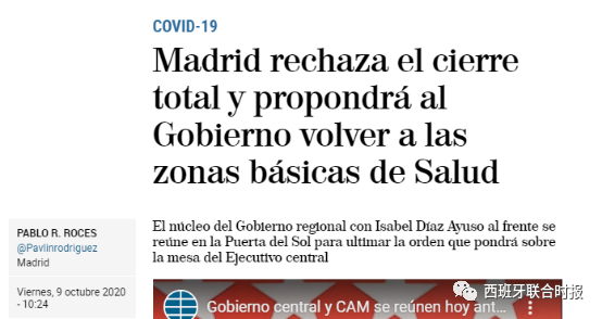昨天下午期间,马德里新冠防疫小组(卫生大臣Illa、卫生部紧急事务主任Simon;大区主席Ayuso、副主席Aguado、卫生部长Escudero和副部长Zapatero)召开了长达5个小时的紧急会议。会上,中央政府和马德里大区双方再度就封禁执行力度问题产生严重分歧。马德里大区政府认为,大区最先实施的基础医疗区域性封禁已经取得良好效果,让马德里大区10万人感染率下降至500人左右,接近欧盟划归的封禁红线。因此,大区要求,中央政府应该将马德里的卫生防疫权利再次下放给大区,按照大区实际所需执行区域性封禁。同时,大区政府也向中央政府承诺,将根据疫情发展实时所需,“扩大或修改局部封禁范围。(habrá «novedades; se podrían actualizar, mejorar o ampliar»)”