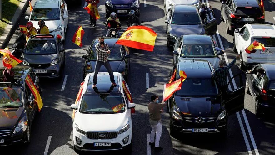 西班牙ABC报消息,数百辆汽车在Vox的召唤下驶往马德里的Paseo de la Castellana,以抗议中央政府在马德里和其他8个城市启动的警戒状态。 本周一Vox党党魁Santiago Abascal谴责了中央政府在马德里启动的警戒状态是非法行为,因此在国庆假期设计了这一“特别庆祝活动”,但其并没有提前通知政府。不过尽管如此,中央政府也部署了国家警察以确保不会发生任何特殊事件。 参加示威游行的汽车和一些敞篷车开过首都的这条“大动脉”,之后经过胡Juan Bravo街的天桥,那里悬挂了几面横幅,上面写道:《马德里是自由的,他们想让马德里沉默»、《你的政府我们的灾难》。 还有的司机停在Castellana和Serrano街上,戴着口罩,高呼“解散政府”。