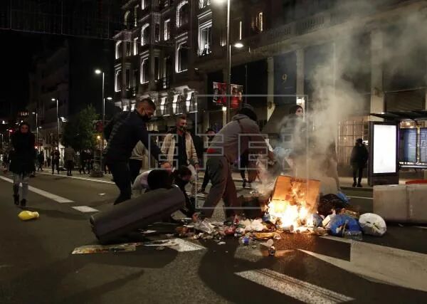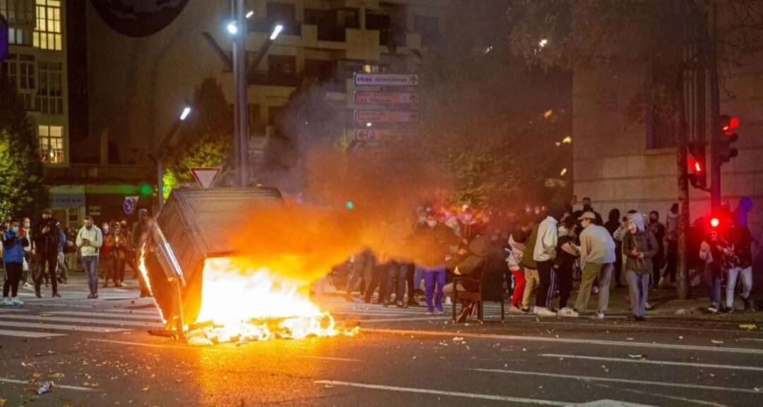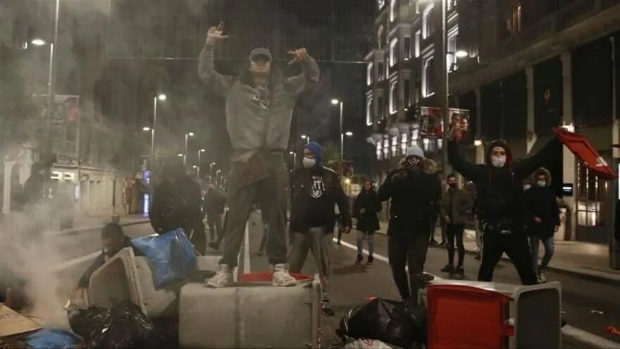 一百多人聚集在街头,高喊反对桑切斯政府的口号。游行过程中,他们还打砸破坏公共设施,并向一些商店的橱窗扔石头。抗议者通过焚烧垃圾桶设置路障,试图切断Gran Vía大街的交通↓