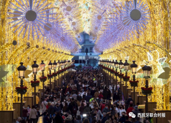 马拉加市中心的Larios大街上,观赏彩灯的人群挤满了长廊。