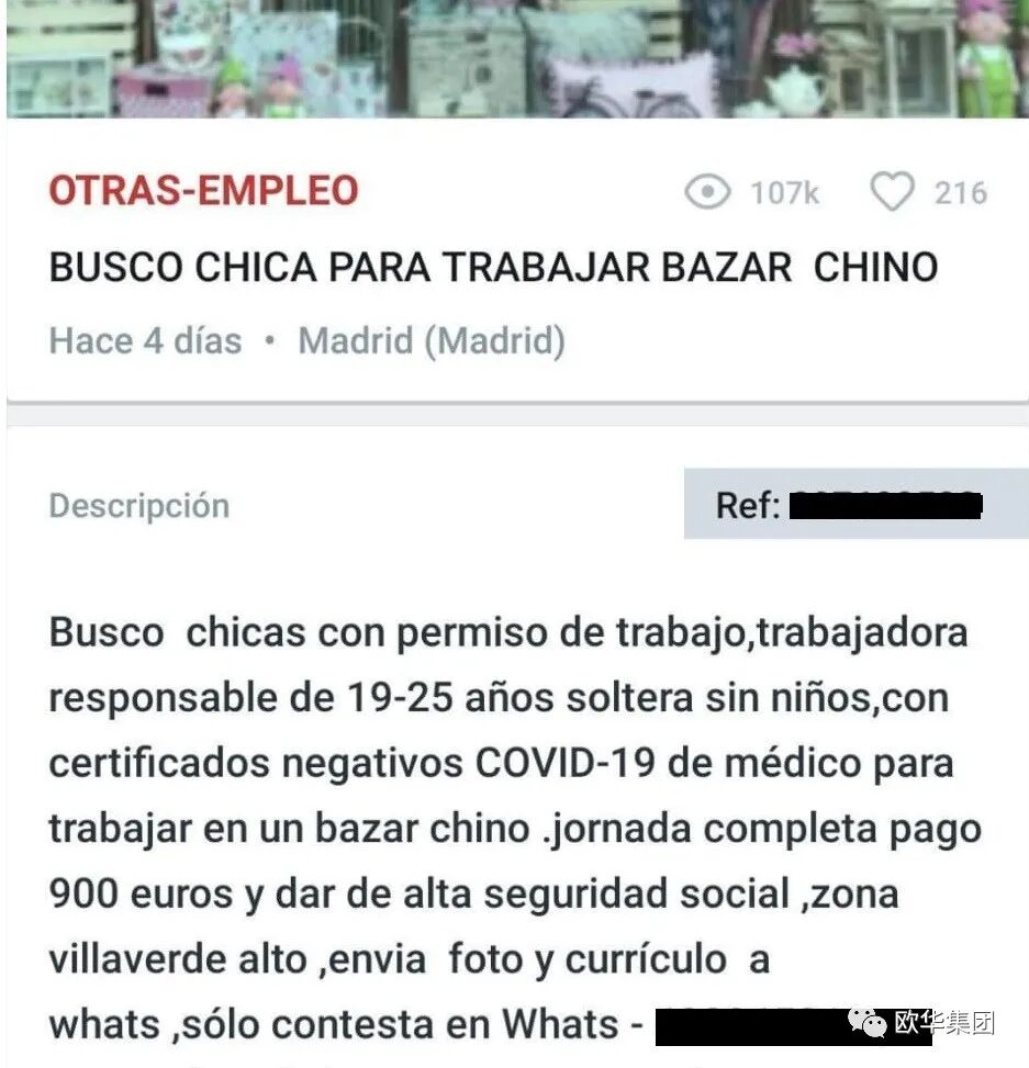![]() 最近,马德里一家华人店对外招聘员工时,也提出这项自然合理的要求。不过,招聘广告上的其他要求和信息惹来了非议,因为招聘要求应聘者为19岁到25岁之间的女性,单身,没有孩子。与此同时,给出的薪资甚至低于西班牙最低薪资标准(SMI),950欧元/月。 违反《劳工法》充满歧视性 据称,上述招聘广告,对性别,年龄,婚姻状况,甚至包括PCR的要求,从头到尾充满了歧视性。劳工顾问Marian Falcón提醒,这种招聘涉及年龄或任何个人问题的要求,如对方是否育有孩子,或是否打算要孩子,均违反《劳工法》第17条有关劳工关系中的非歧视规定。
