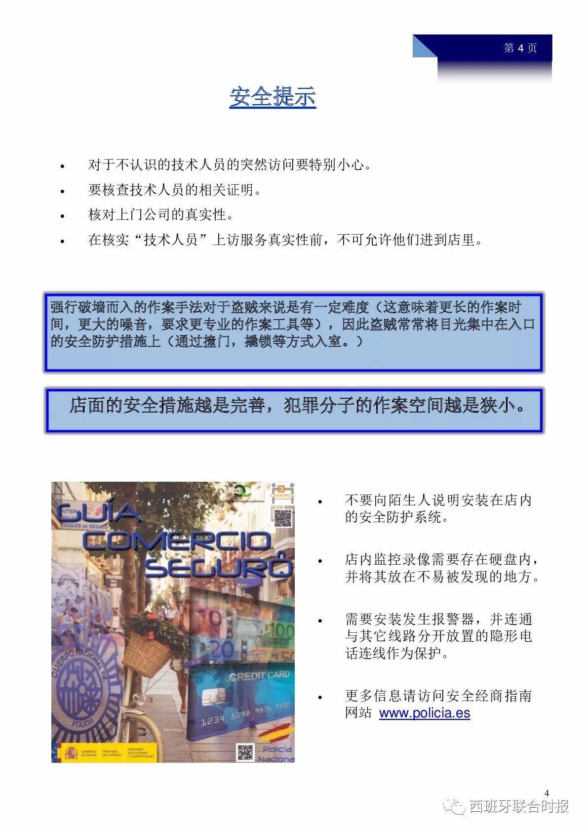 节日期间,犯罪率通常会增加,为了广大华人侨民的安全,西班牙国家警察局市民服务中心特别发布中文指导书,提醒大家注意安全,避免被入室盗窃。